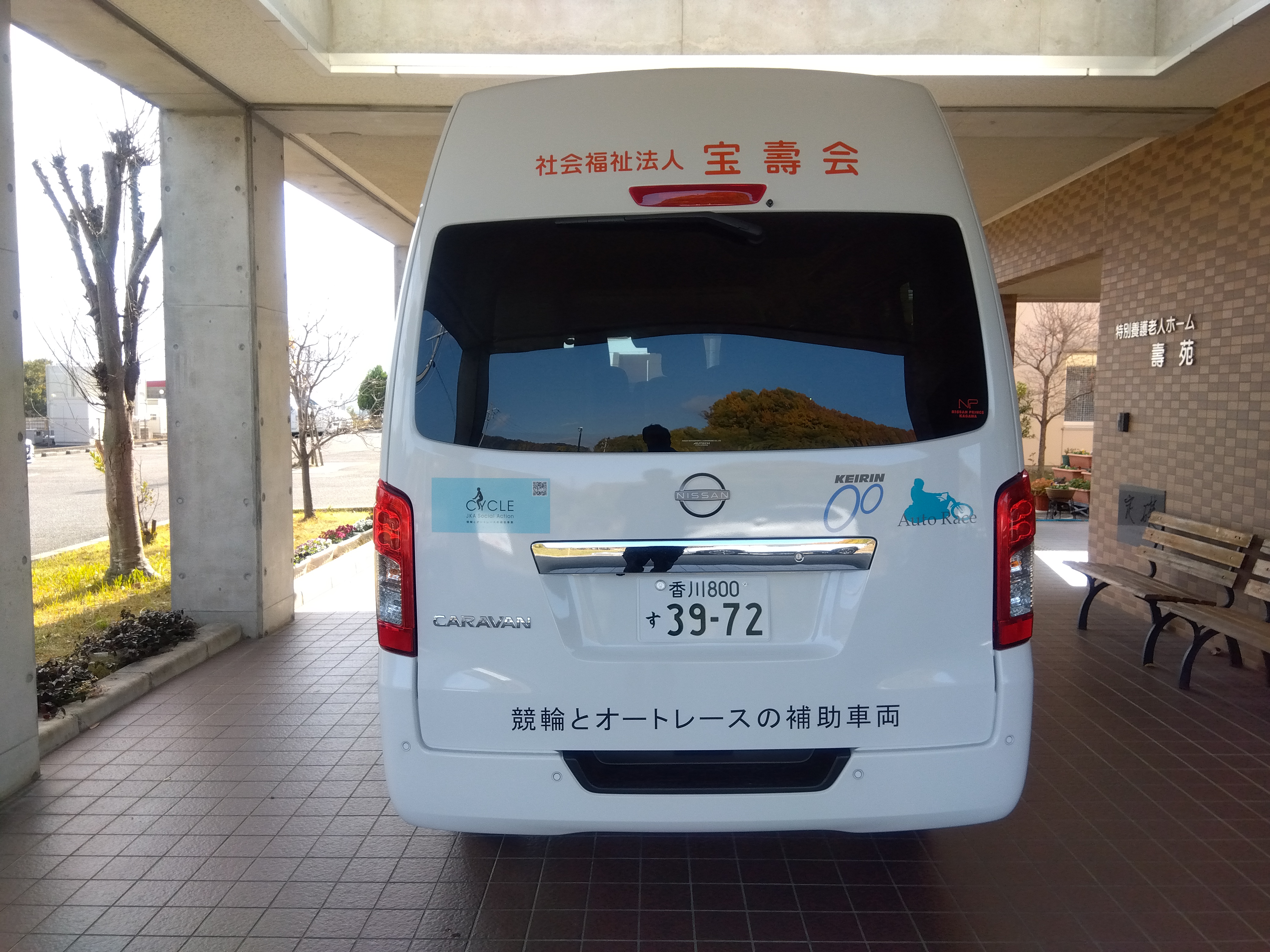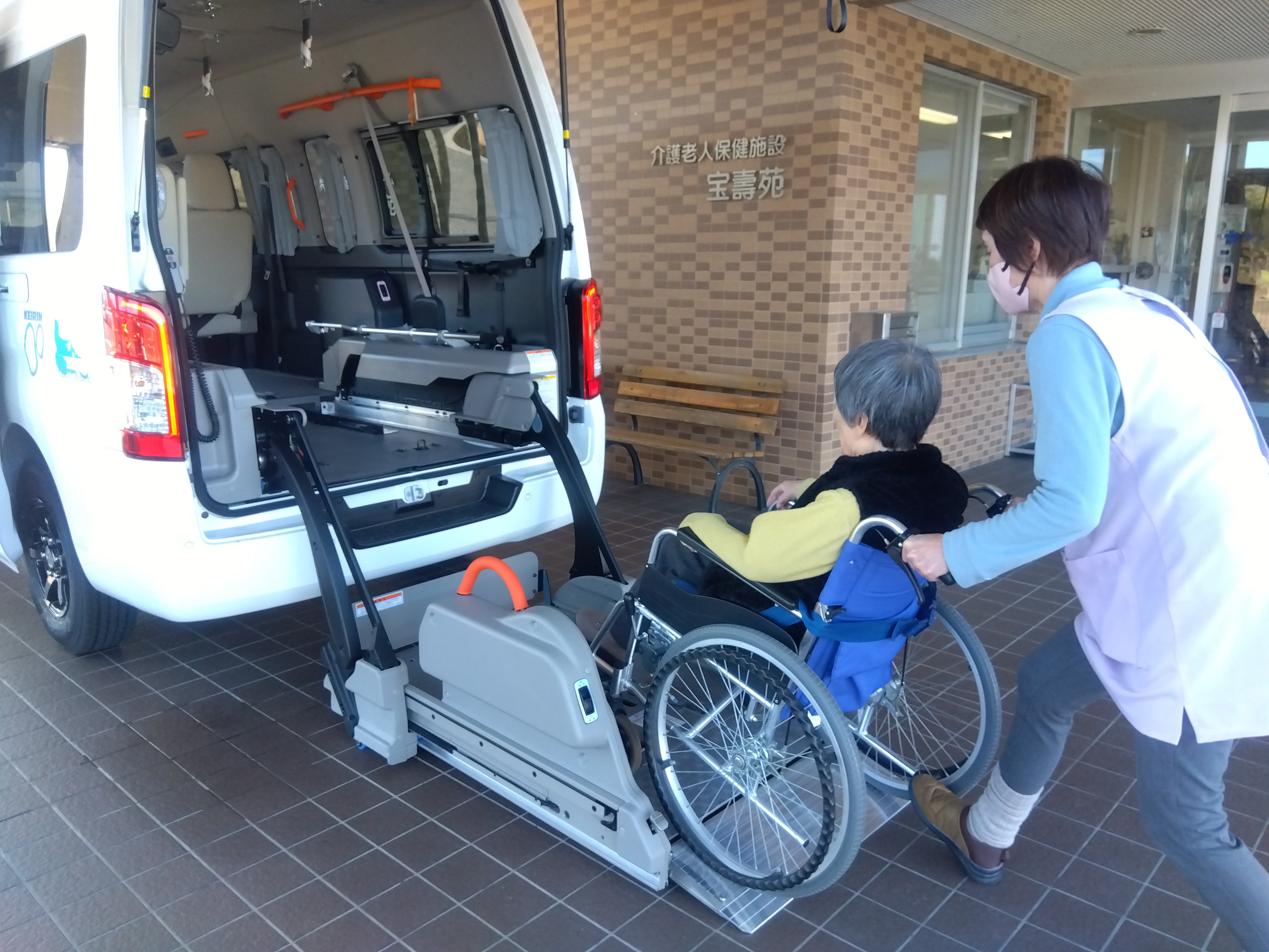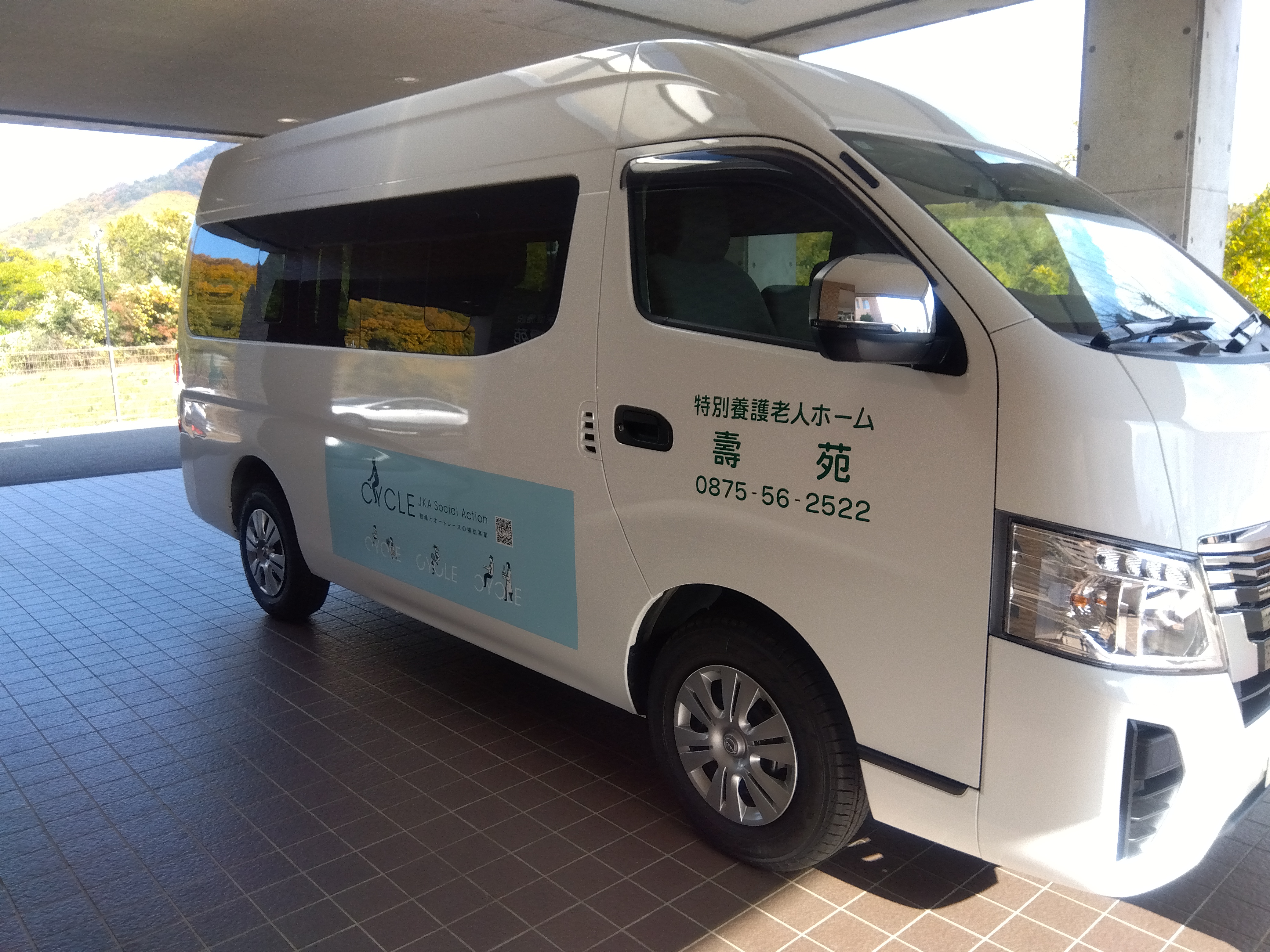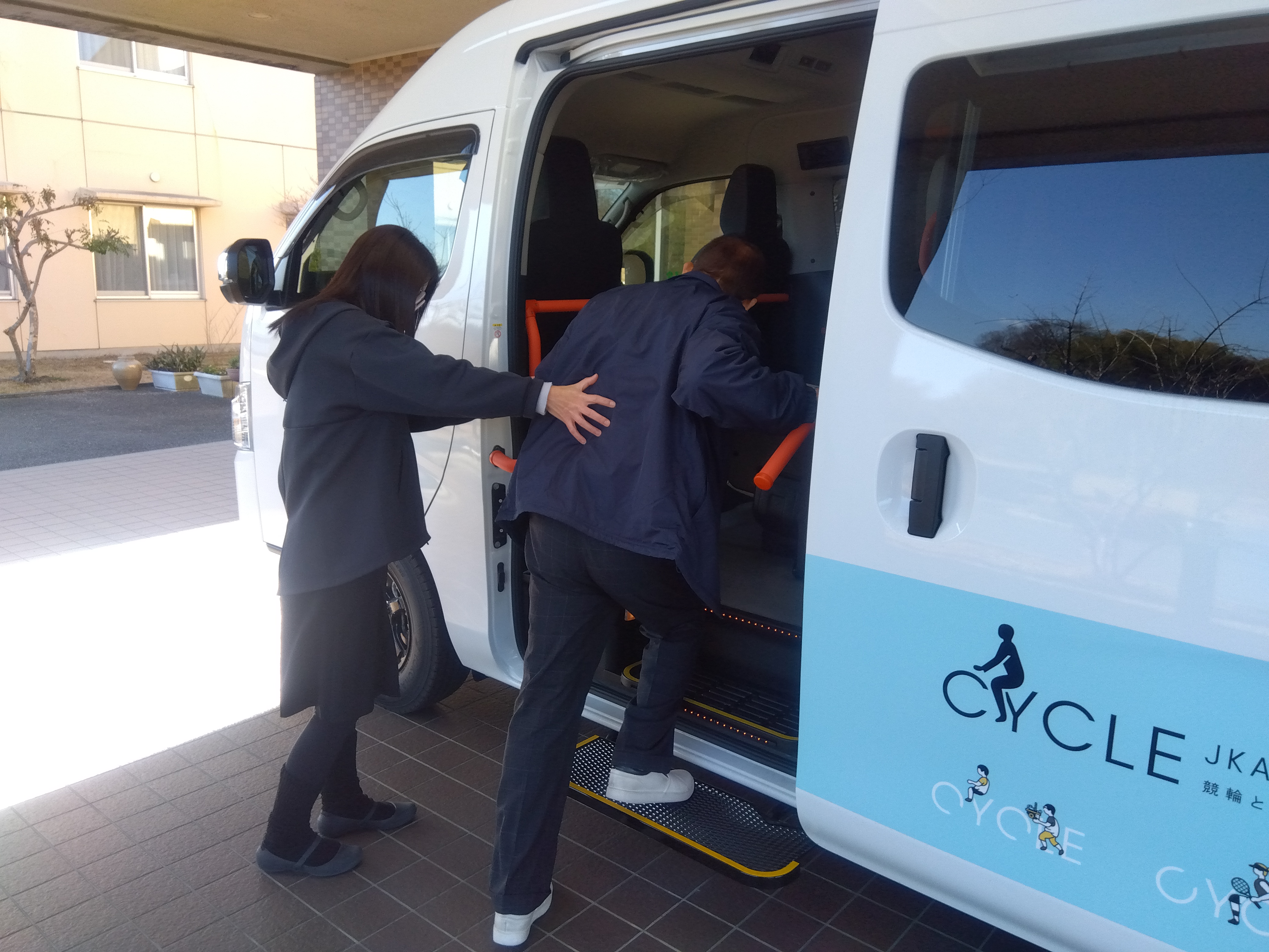 2025年11月末「公益財団法人JKA 公益事業振興補助事業 福祉車両の整備補助事業」を活用し、福祉車両(車椅子仕様リフト式)を購入しました。デイ利用者様の送迎、入所者様の受診等で送迎等に使用しています。車体側面乗降口に出てくる手摺りやステップ、更に車内段差にLEDライトの照明設置があり利用者様がより安全に使用できます。また、病気の利用者に酸素ボンベ固定金具や点滴固定金具取付、特殊車椅子固定ベルトもあります。これによって送迎中、重度者の体の揺れが少なく送迎が楽になり、軽度者に関してもスムーズで蹴躓くことなく安心して乗れるようになりました。また、職員も介護負担軽減や精神的ストレスの軽減にもつながっています。